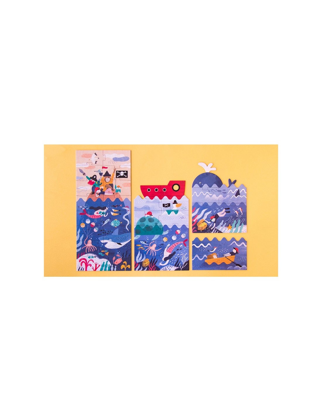 Découvrez l'histoire du trésor caché derrière ces 4 puzzles de 4, 8, 12, 16 pièces qui sont assemblés en couches !
