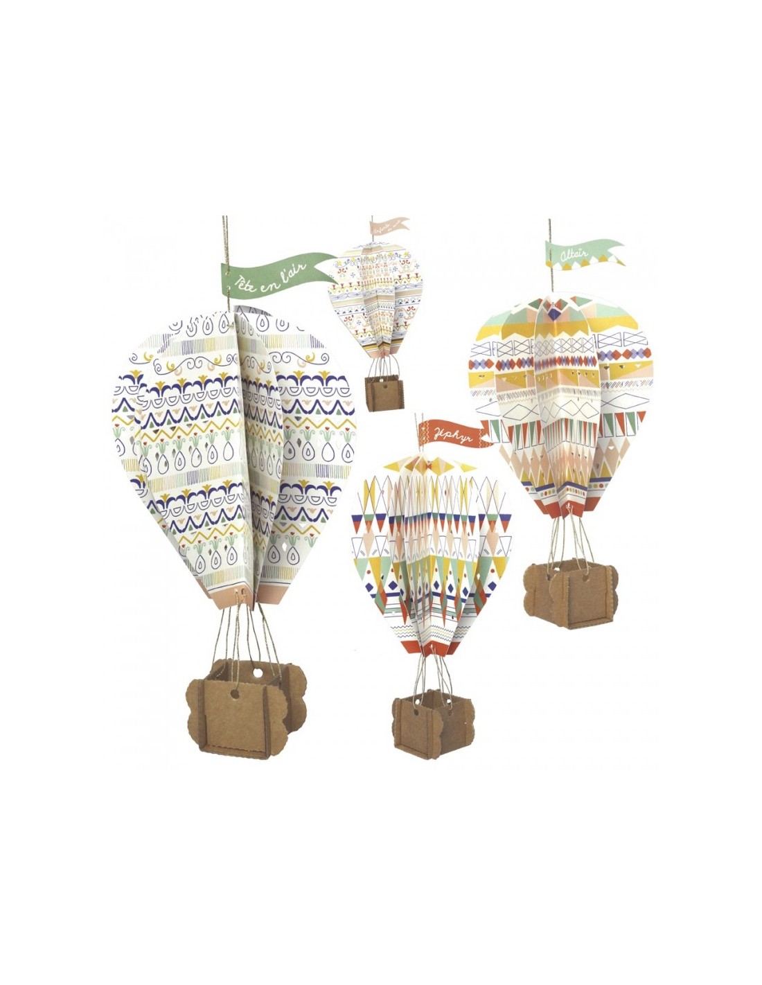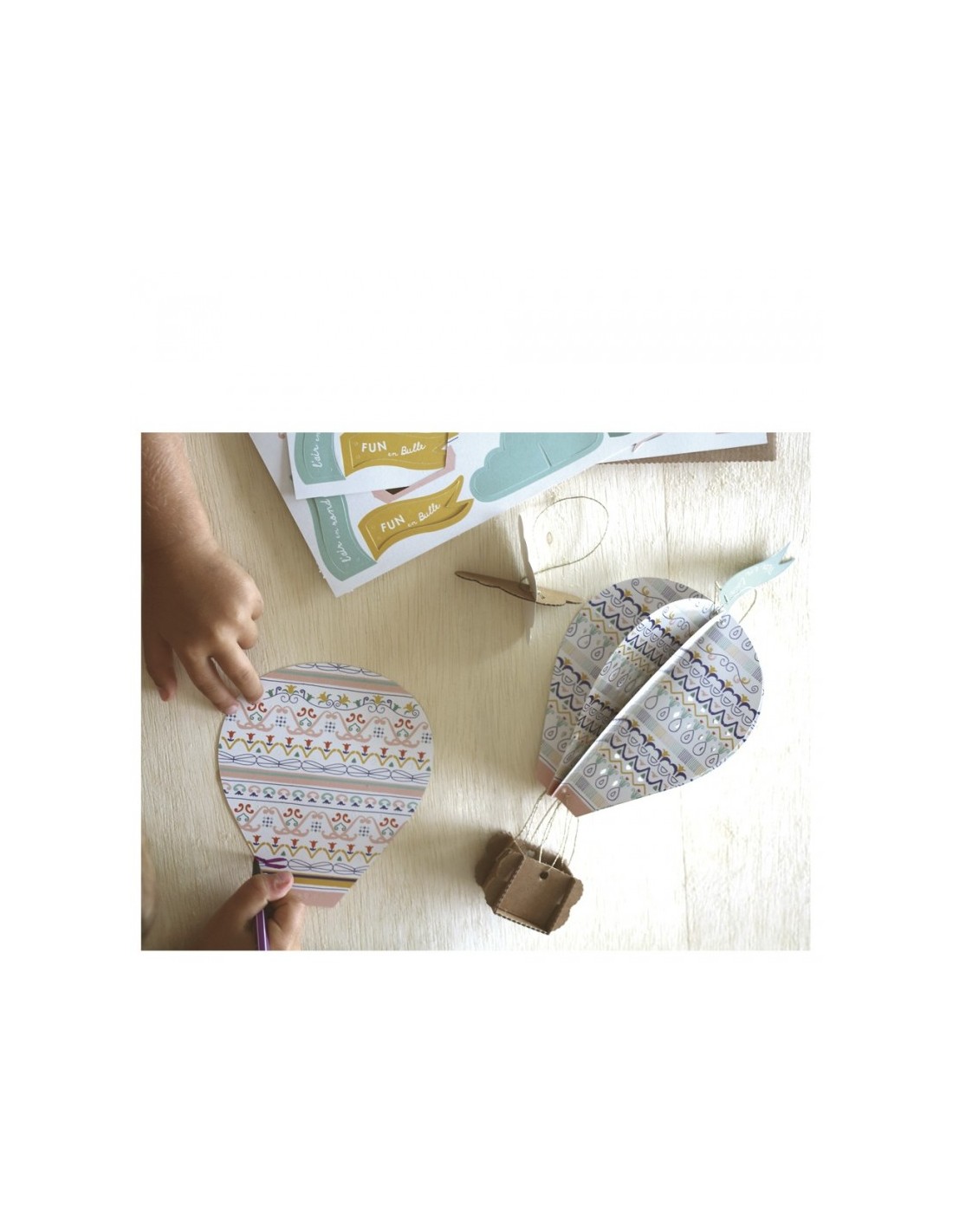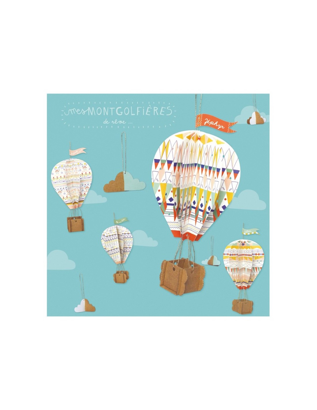 Un atelier créatif pour faire le plein d'imaginaire : 4 montgolfières et 4 nuages en papier et carton à fabriquer et à suspendre.
