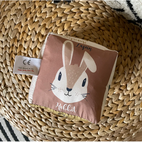 Ce cube d'éveil Animaux et compagnie Carotte & cie en tissu de coton biologique est idéal pour éveiller la découverte sensorielle de bébé.