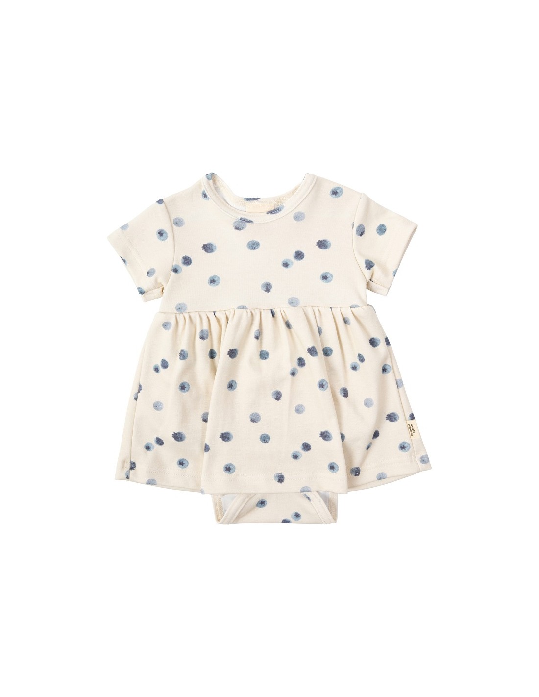 Cette robe body manches courtes Myrtilles Wooly organic est fabriquée en jersey de coton certifié GOTS.