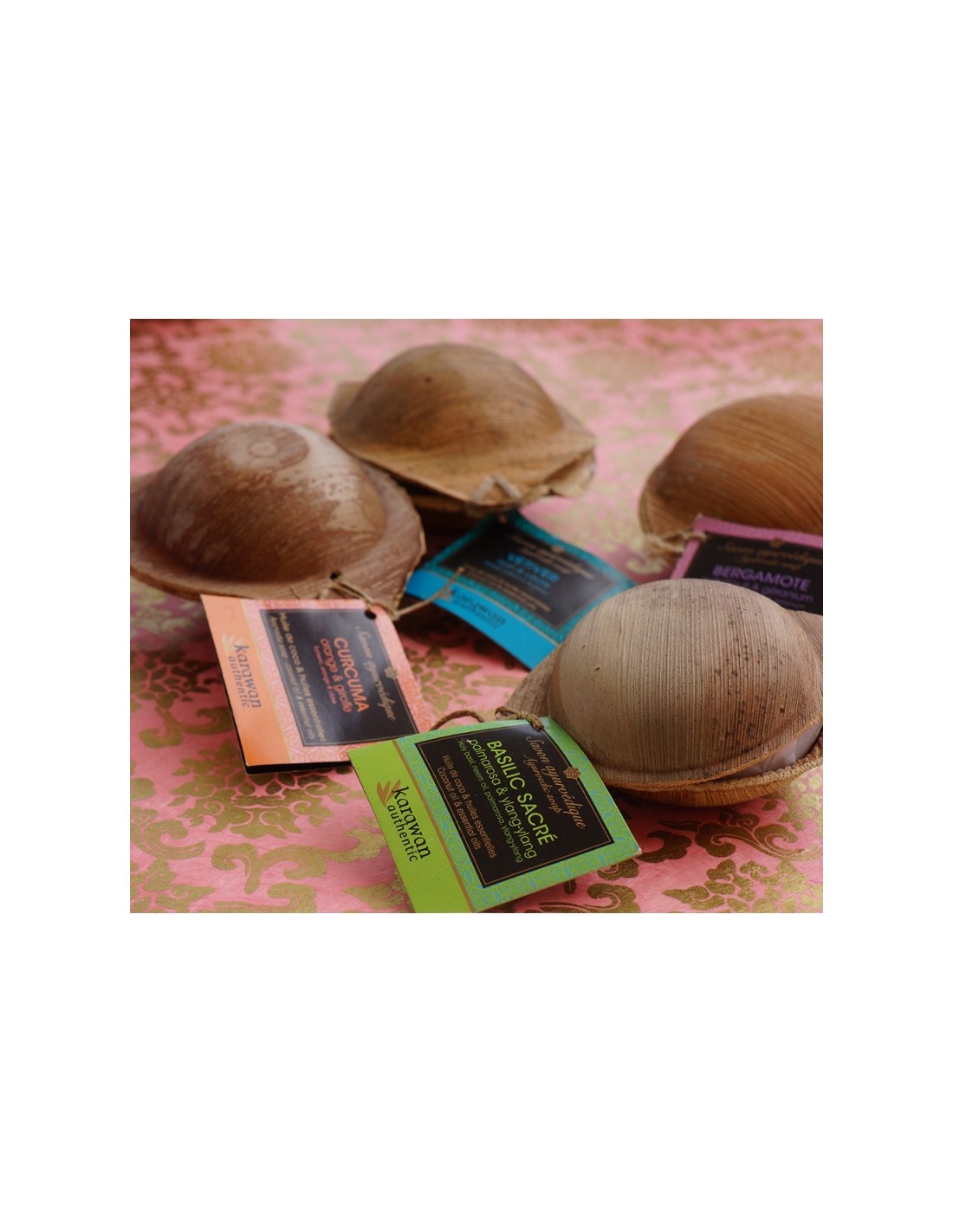 Les savons sont conditionnés dans une feuille de palmier séchée et moulée. Cette coque végétale sert de porte-savon et de boite à emporter dans sa trousse de toilette.