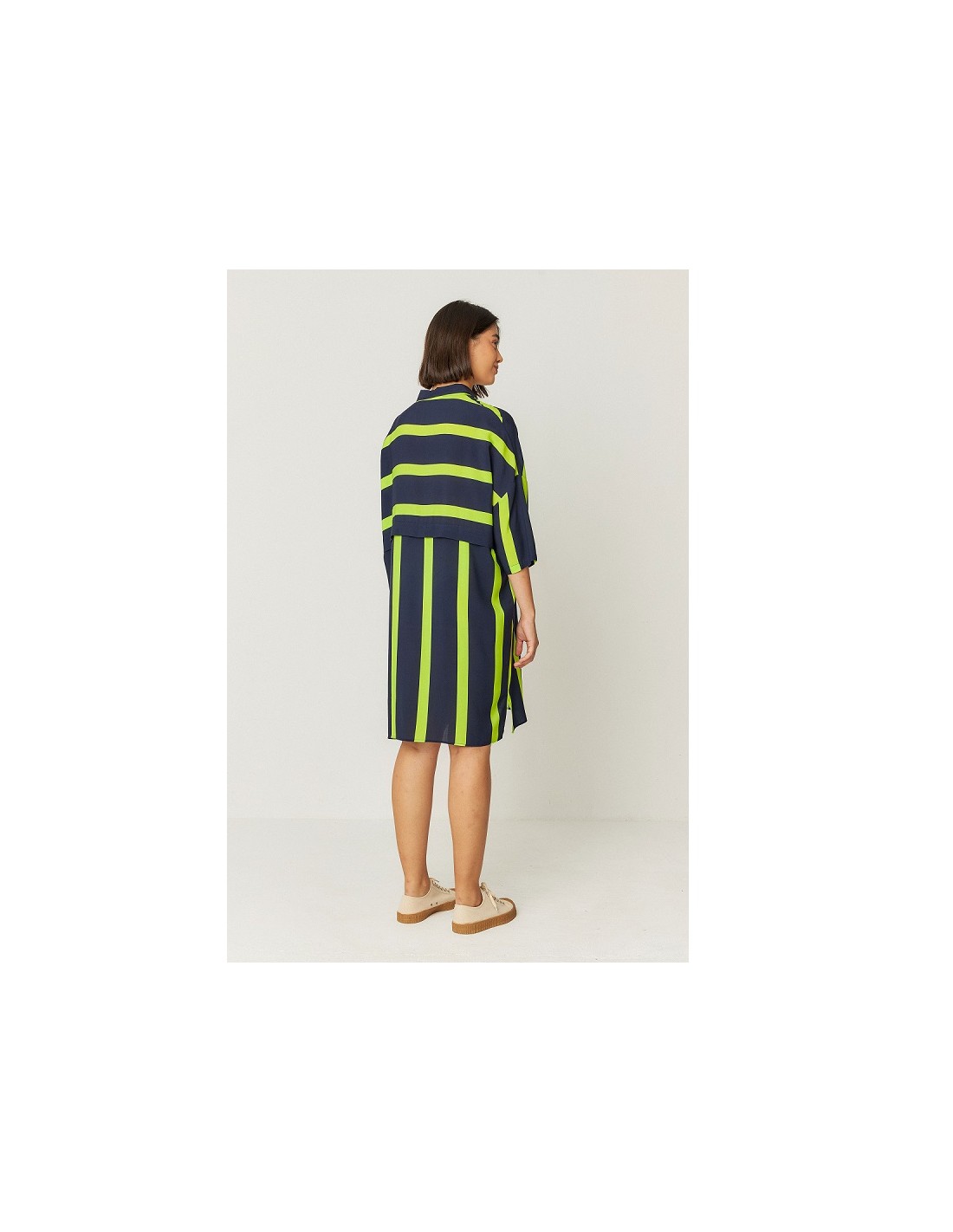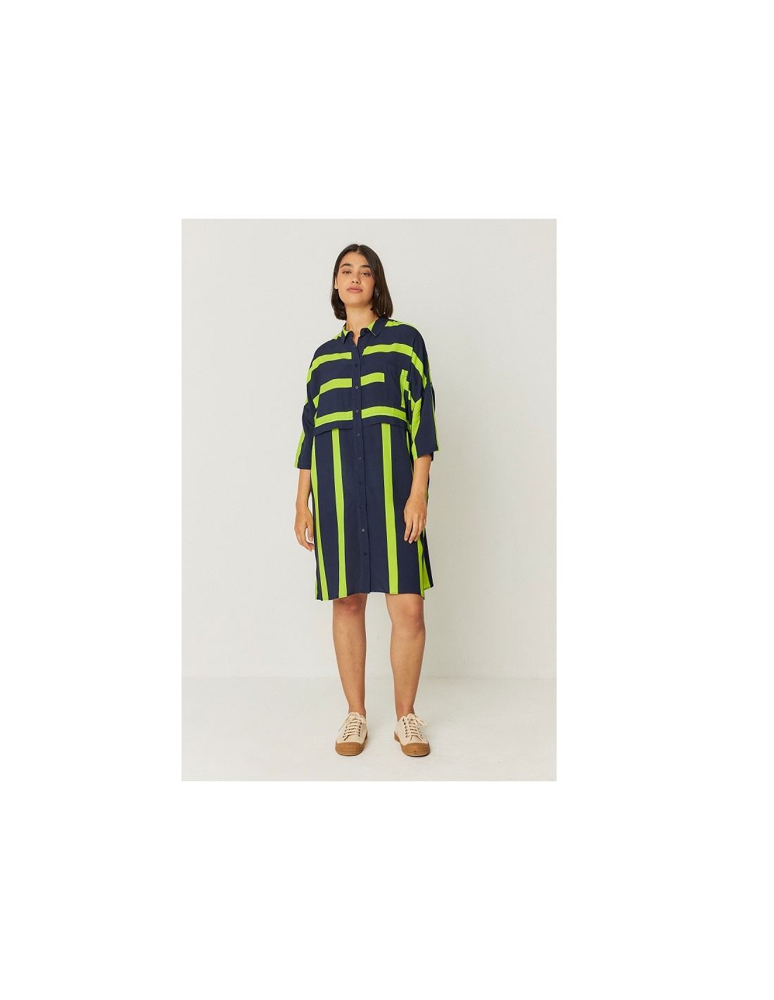- Détails du produit : coupe ample, manches 3/4, poche sur le devant gauche, boutons devant, longueur genou.