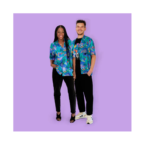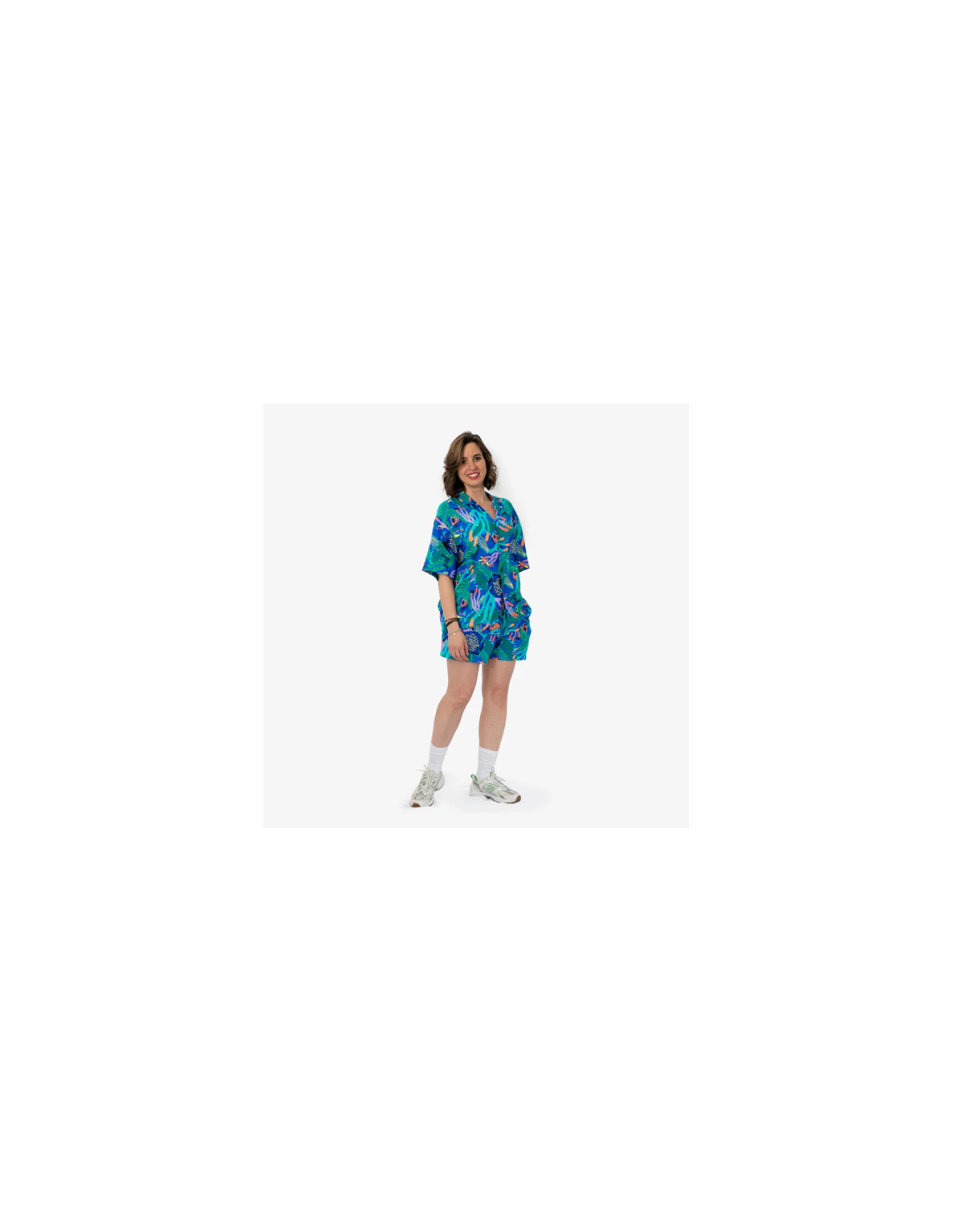 - Détails du produit : coupe ample et droite, manches au niveau du coude, col chemise, boutons devant, imprimé jungle aquatique sur fond bleu turquoise.