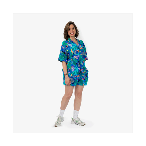 - Détails du produit : coupe ample et droite, manches au niveau du coude, col chemise, boutons devant, imprimé jungle aquatique sur fond bleu turquoise.