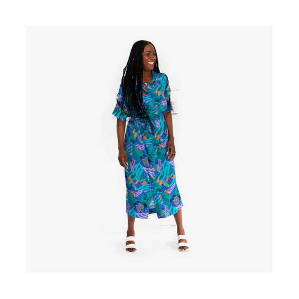• Détails du produit : coupe ample et droite, manches au niveau du coude, col chemise, boutons devant sur toute la hauteur, robe longue, ceinture imprimée amovible, imprimé jungle aquatique sur fond bleu turquoise.