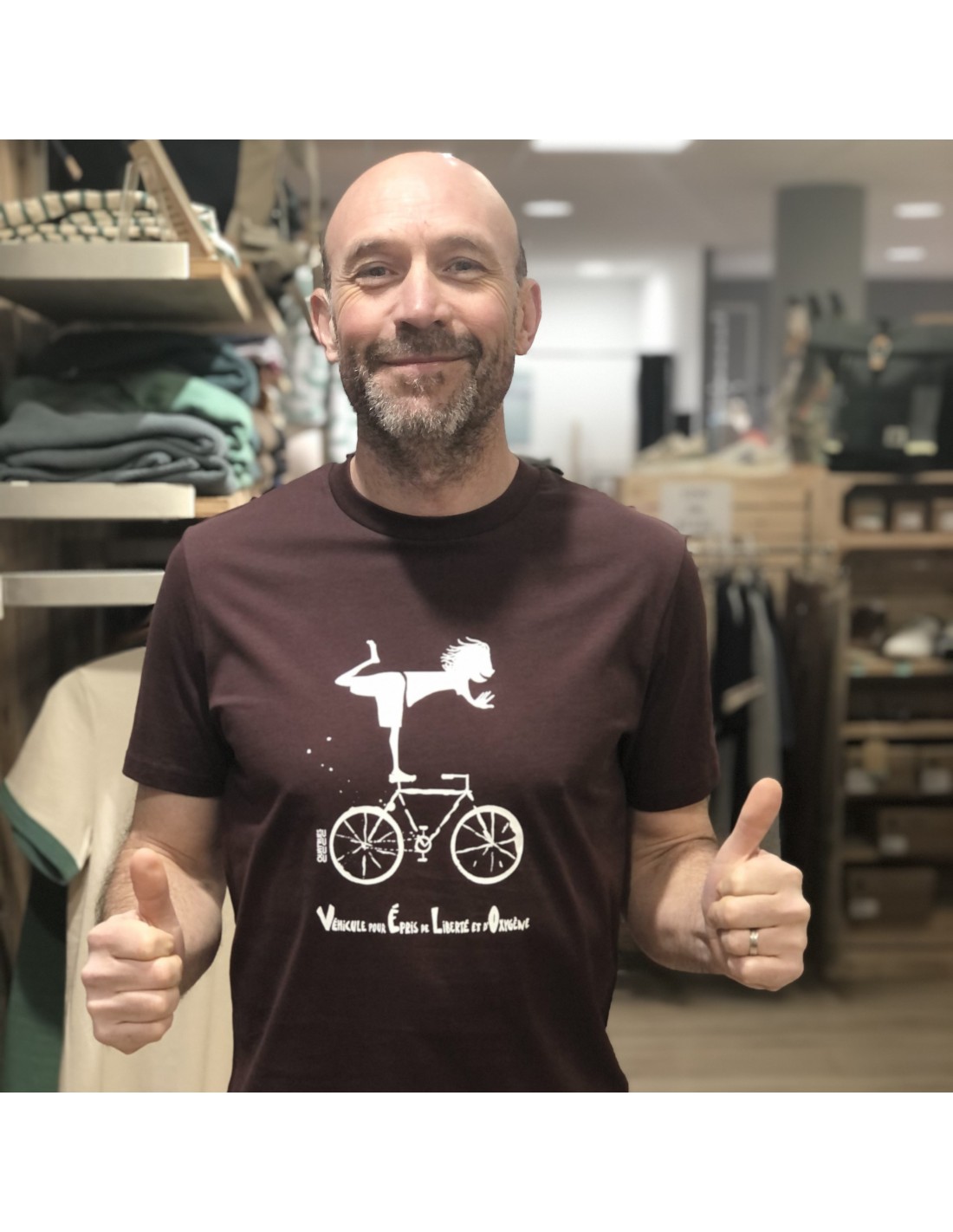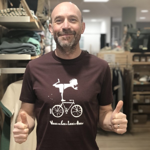 Ce T-shirt manches courtes douala Vélo brun rouge - Quat'rues en coton bio vous permettra d'afficher et d'affirmer vos valeurs et vos différences !