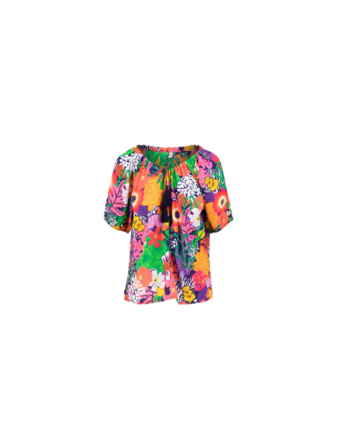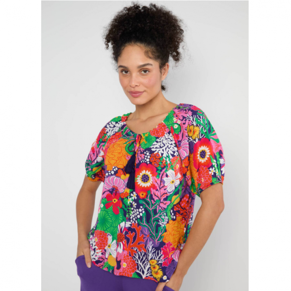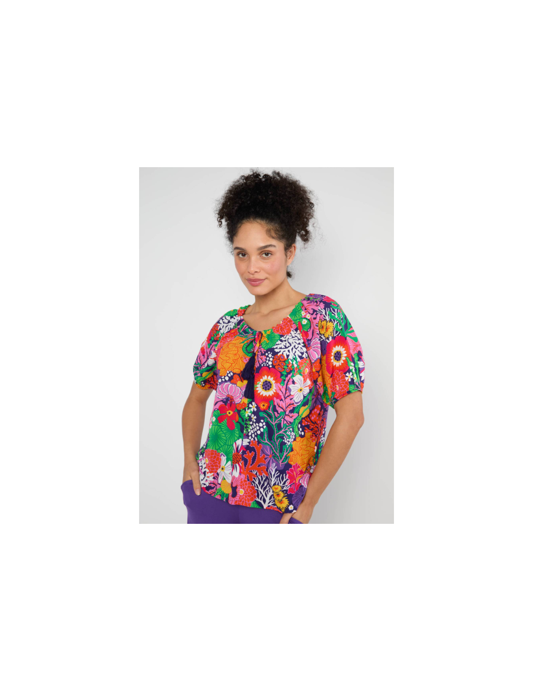 • Détails du produit :manches courtes larges resserrées par un élastique, col bateau que l'on peut laisser ouvert ou resserré par le lacet violet à pompons, coupe large, tissu léger et fluide, imprimé haut en couleurs !