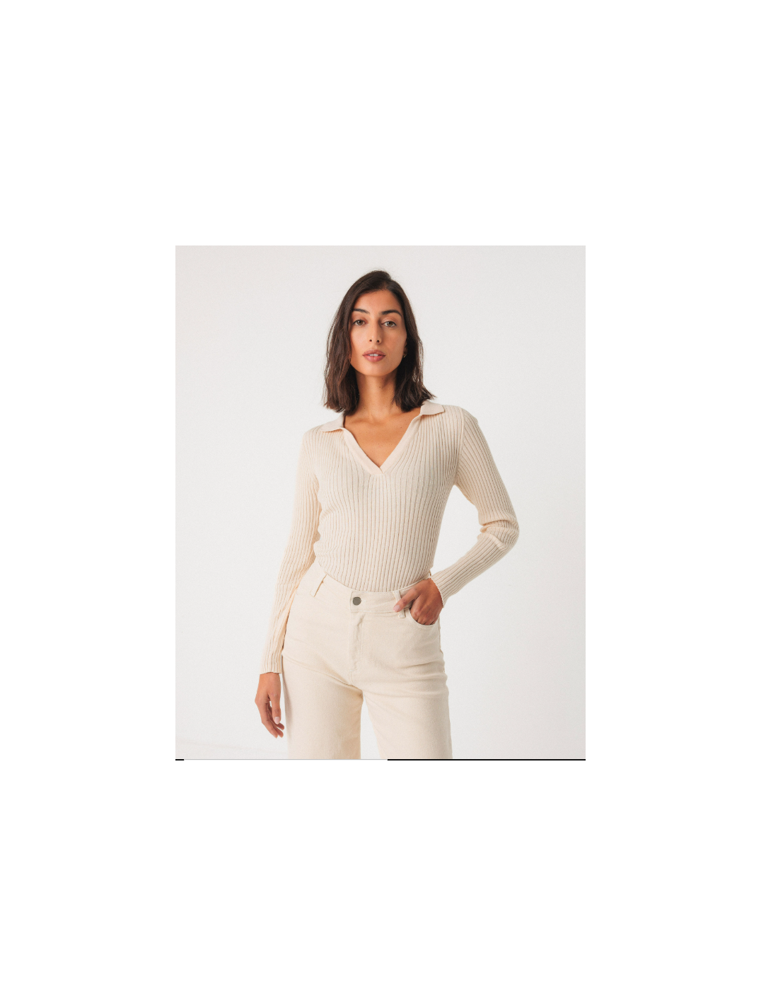 • Détails du produit : manches longues, col V avec col chemise, matière côtelé, uni écru.