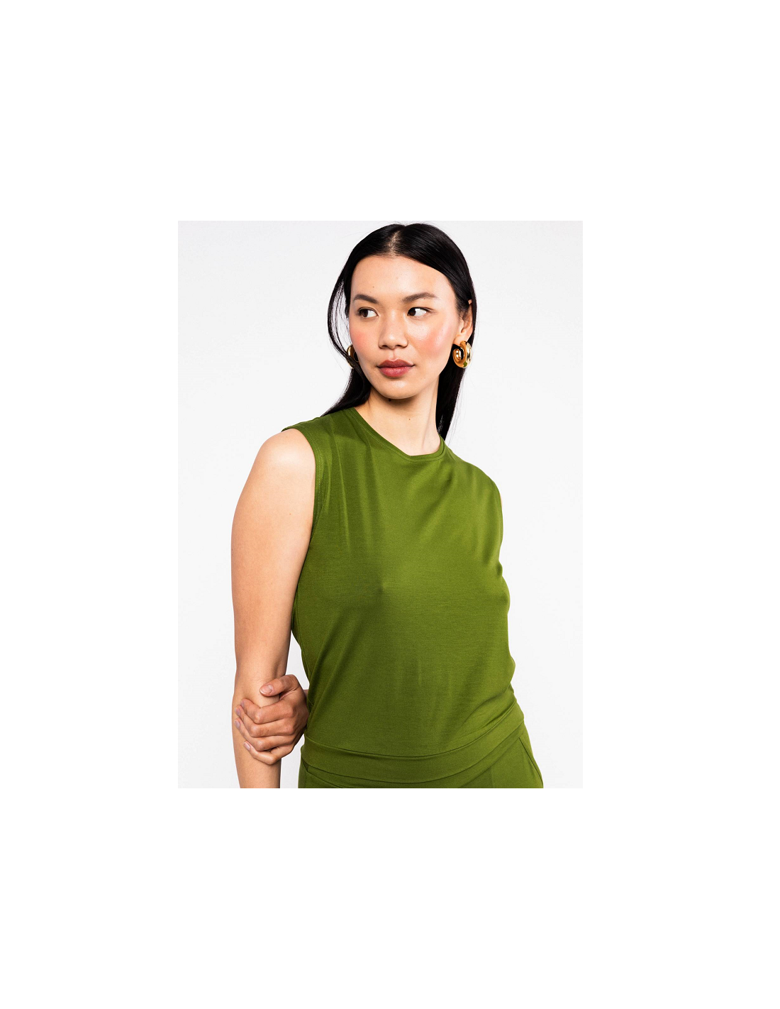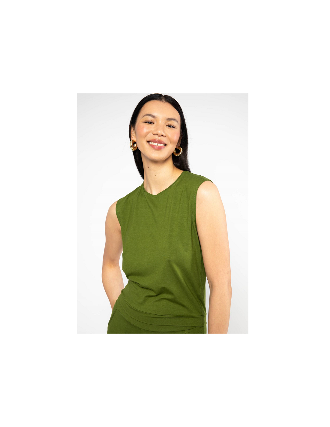- Détails du produit : débardeur basic, col rond liseré fin, uni vert, sans manches, coupe ajusté à la taille.