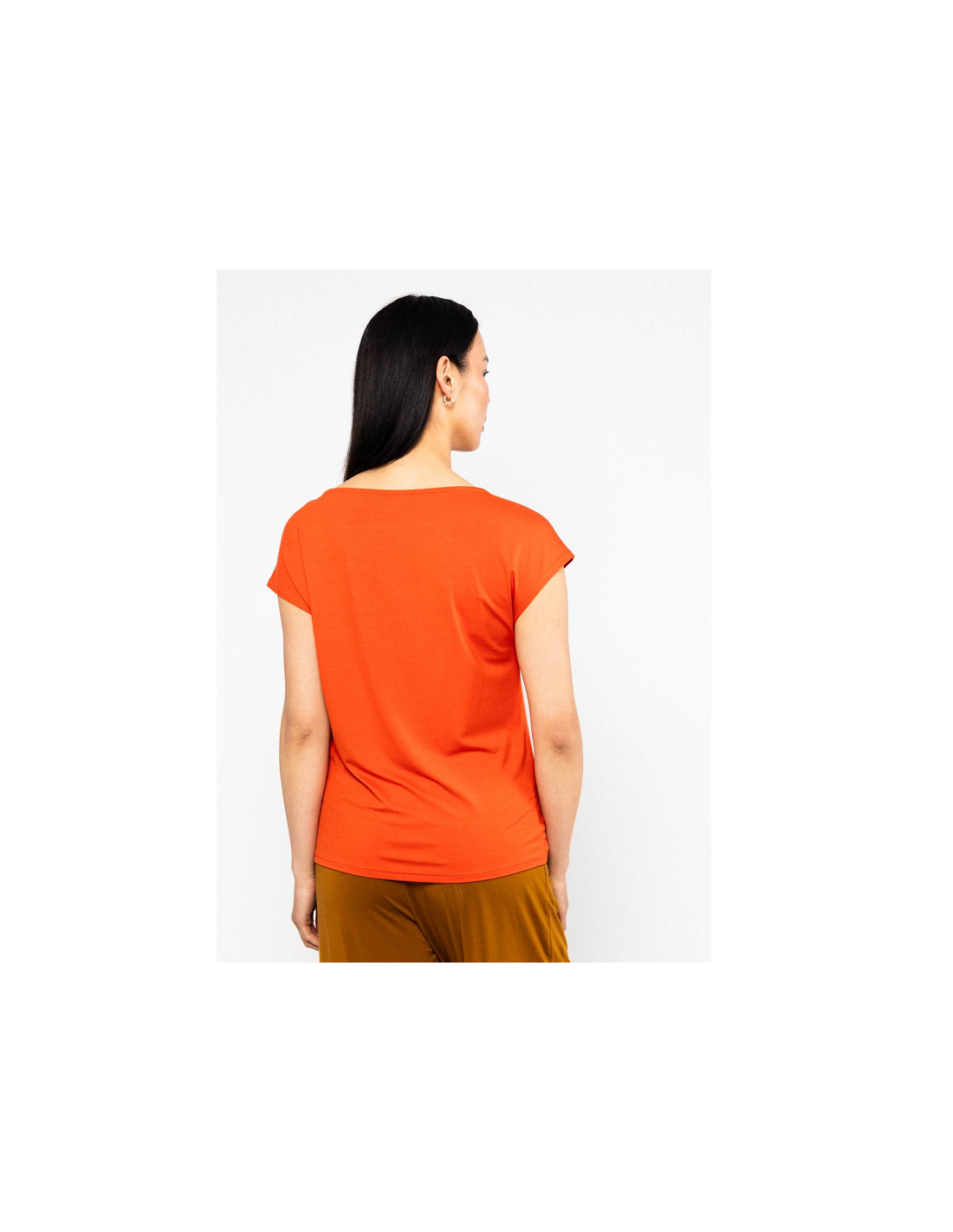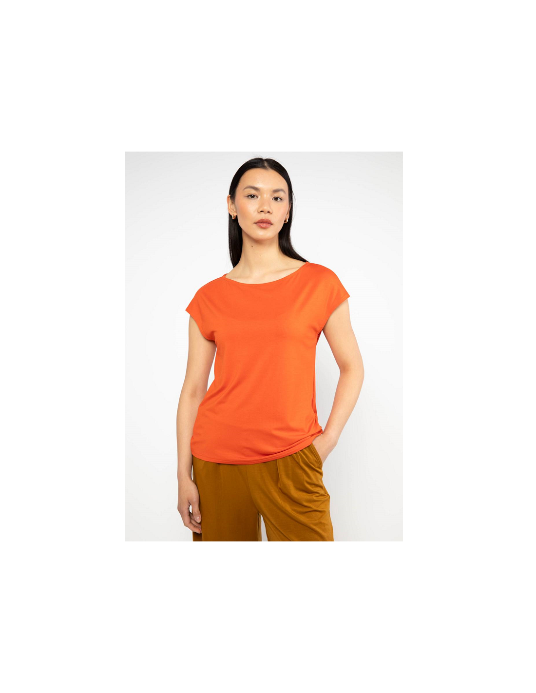 - Détails du produit : haut basic, col rond liseré fin, uni orange, manches courtes épaules, coupe droite.