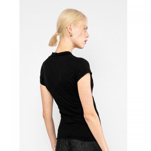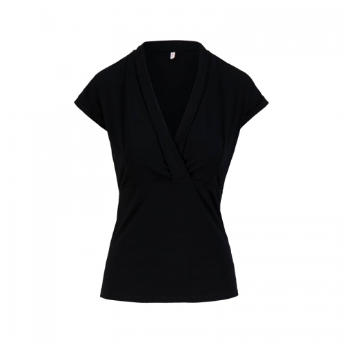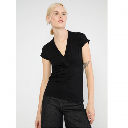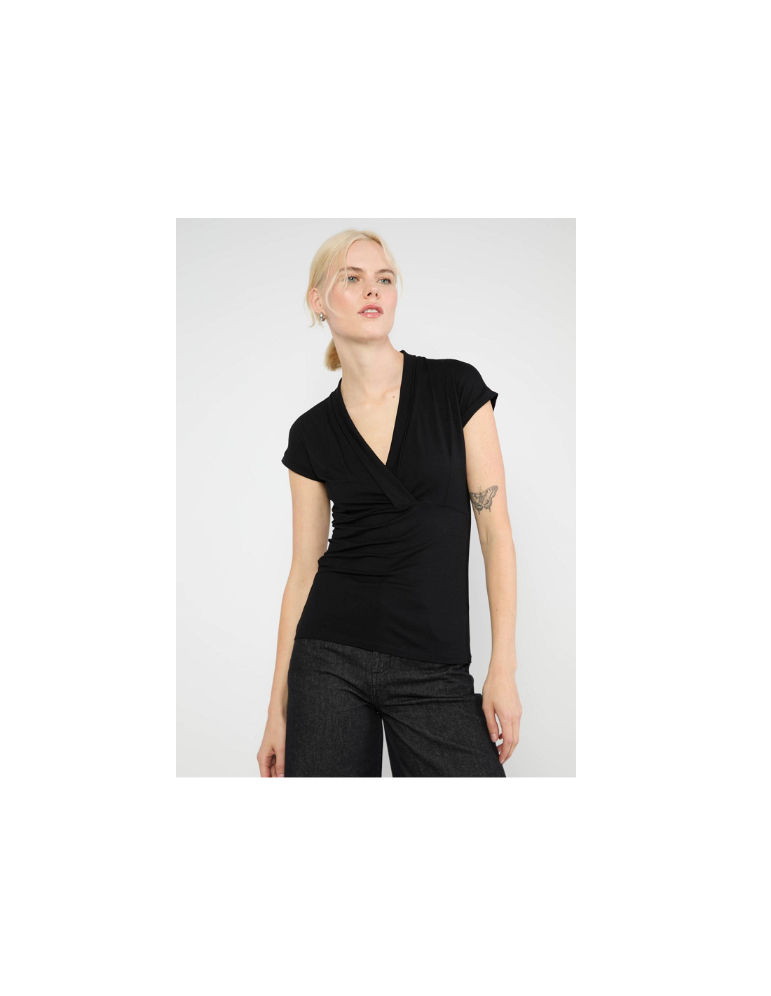 - Détails du produit : col V, effet cache coeur, manches courtes non démarquées, tissu fluide.