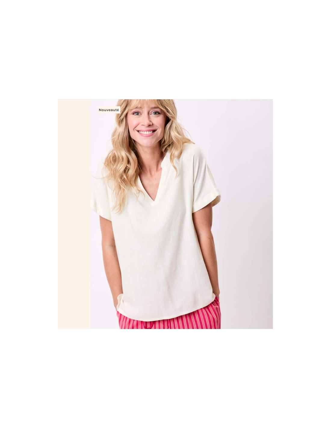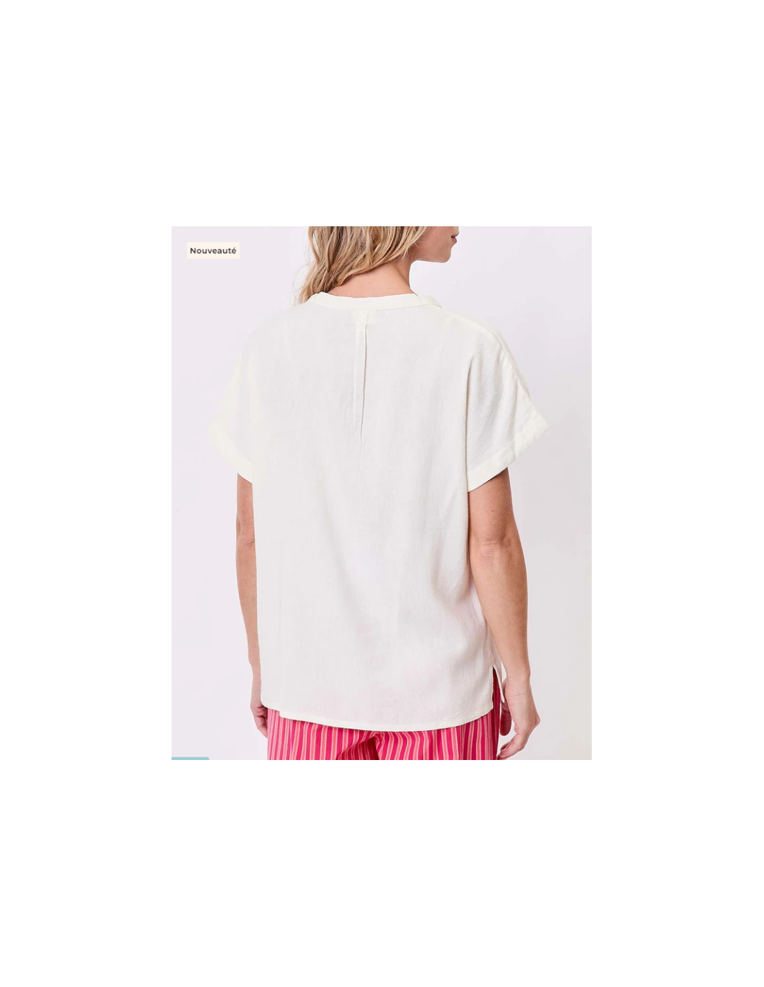 - Détails du produit : coupe droite, ouverture col V devant, petites manches.
