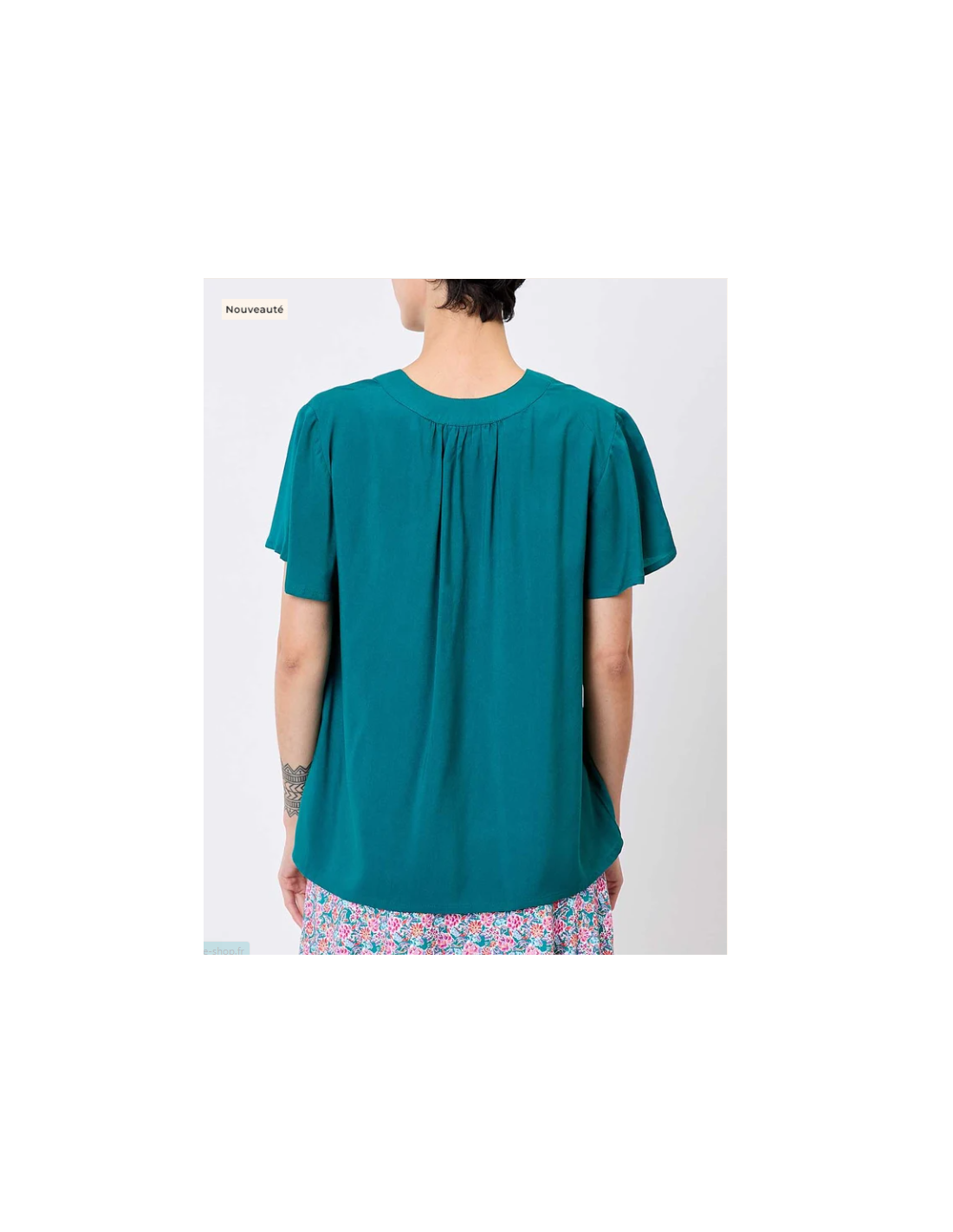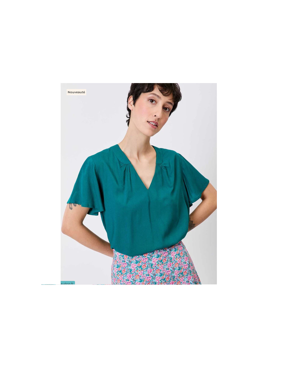 - Détails du produit : top col V, manches courtes, fronces dans le dos, matière légère et fluide .