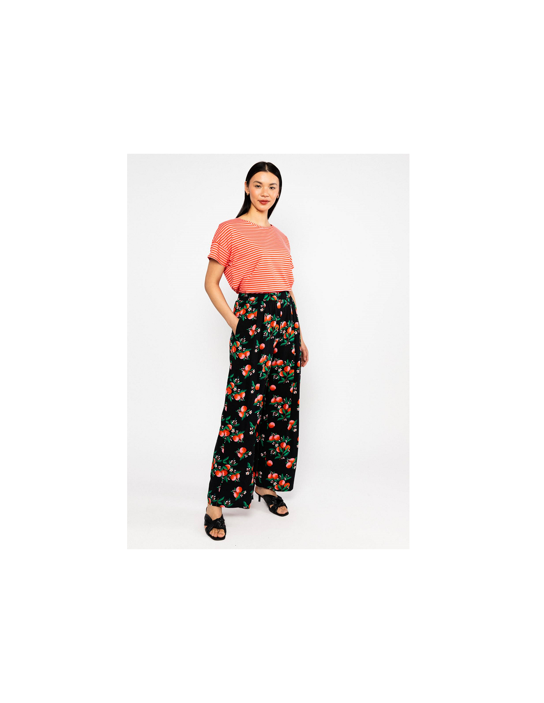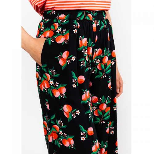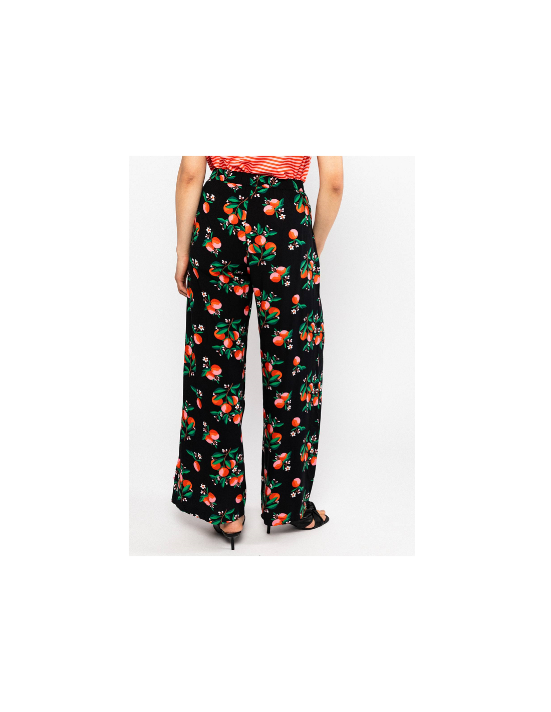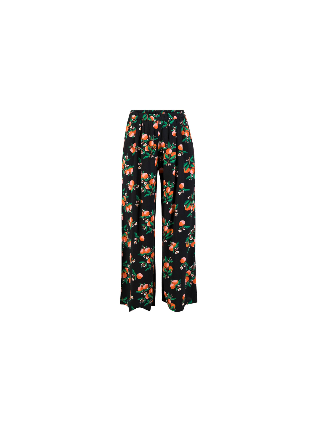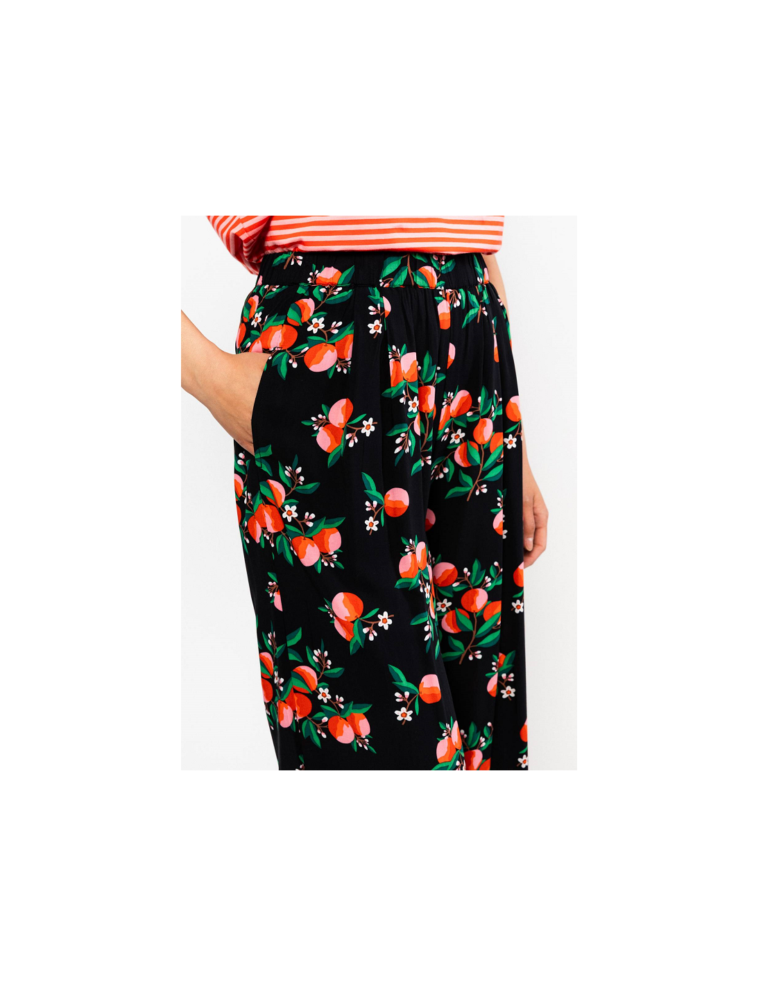- Détails du produit : pantalon long et large, 2 poches pour les mains, élastique à la taille, imprimé fleuri et orange.
